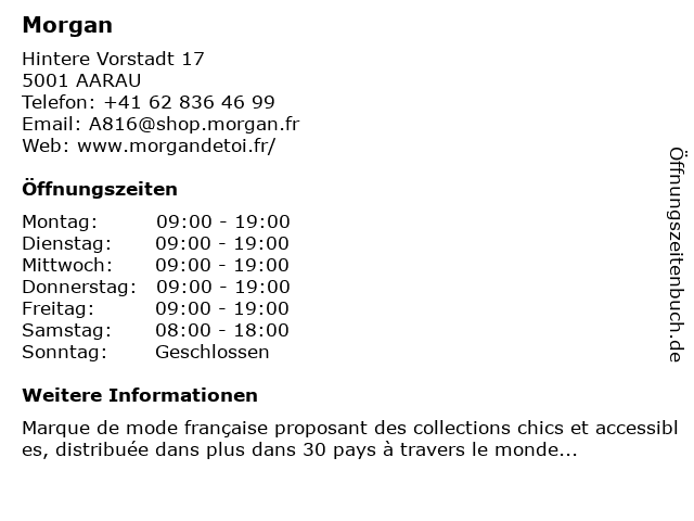 | Öffnungszeiten Morgan in AARAU anzeigen | |