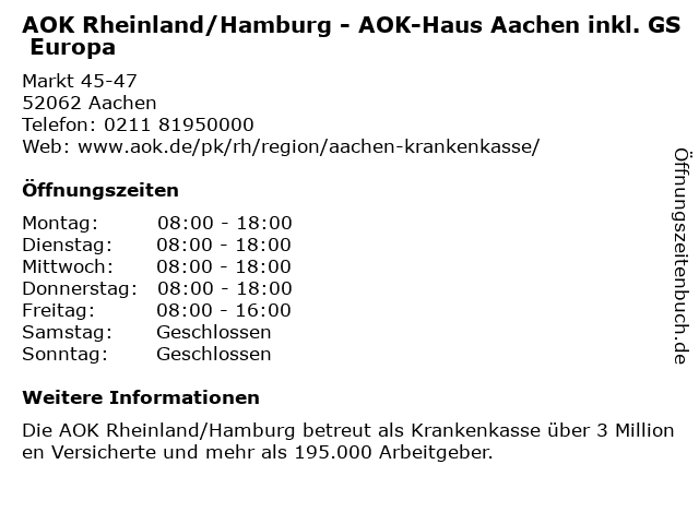 Öffnungszeiten AOK Rheinland/Hamburg - AOK-Haus Aachen inkl. GS Europa