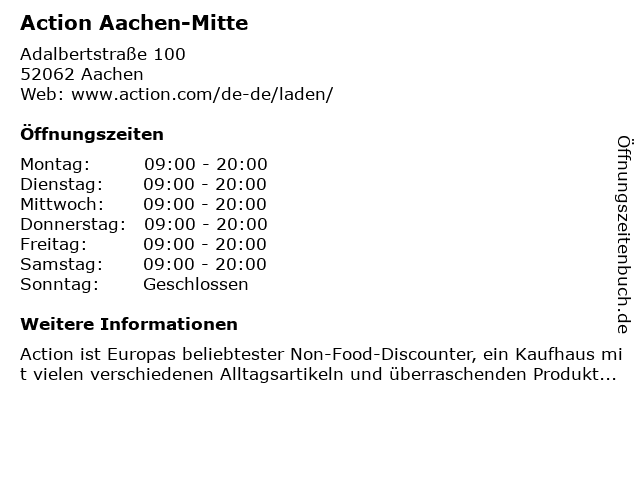 | Öffnungszeiten Action Aachen-Mitte in Aachen anzeigen | |
