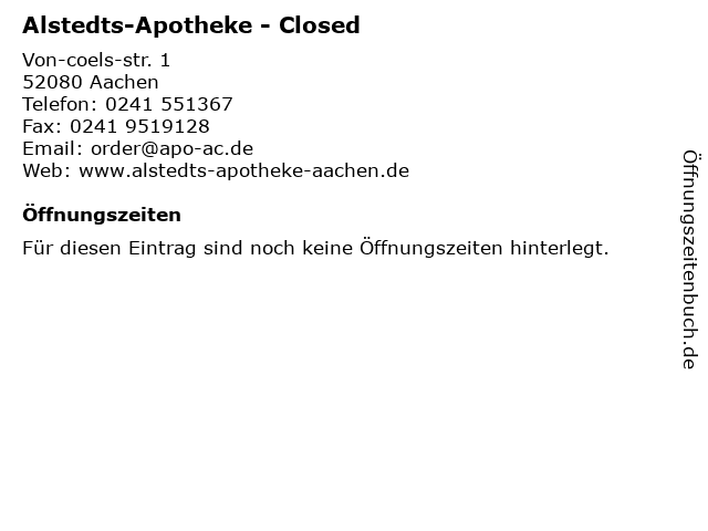 | Öffnungszeiten Alstedts-Apotheke - Closed in Aachen anzeigen | |