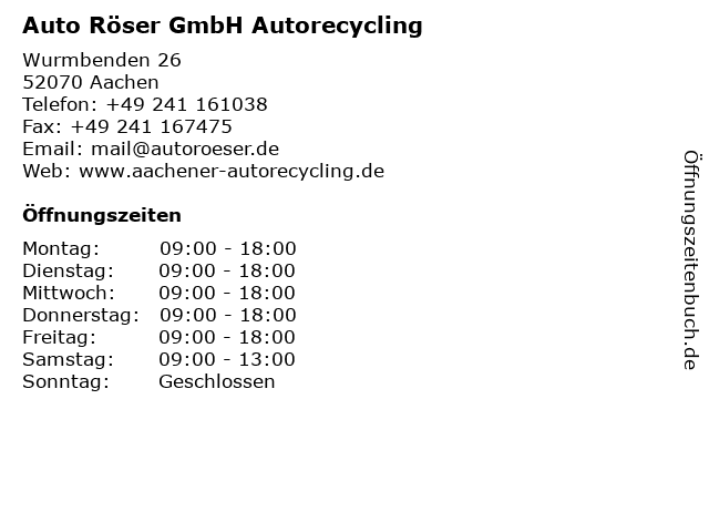 | Öffnungszeiten Auto Röser GmbH Autorecycling in Aachen anzeigen | |