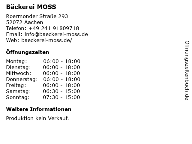 | Öffnungszeiten Bäckerei MOSS in Aachen anzeigen | |
