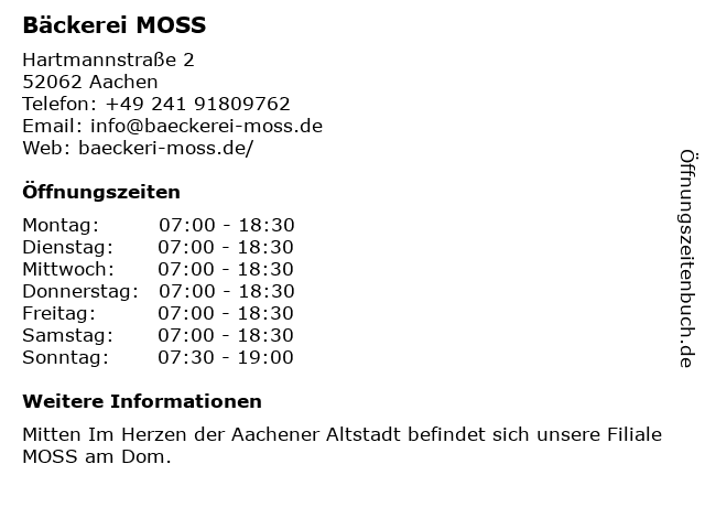 | Öffnungszeiten Bäckerei MOSS in Aachen anzeigen | |