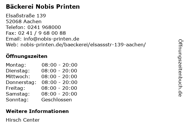 Öffnungszeiten Bäckerei Nobis Printen in Aachen anzeigen | |
