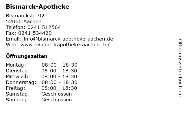 | Öffnungszeiten Bismarck-Apotheke in Aachen anzeigen | |