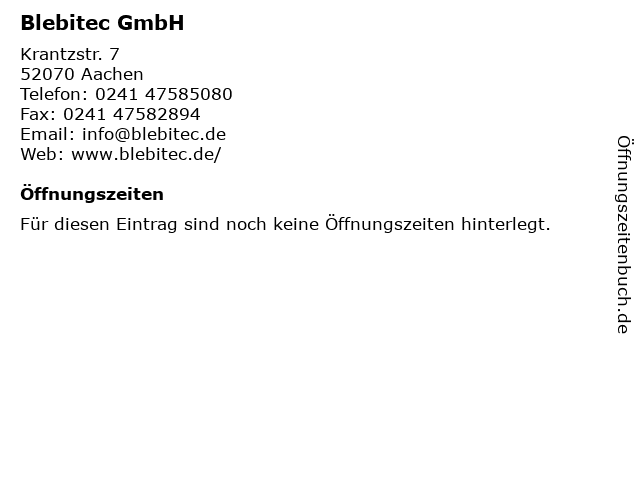| Öffnungszeiten Blebitec GmbH in Aachen anzeigen | |