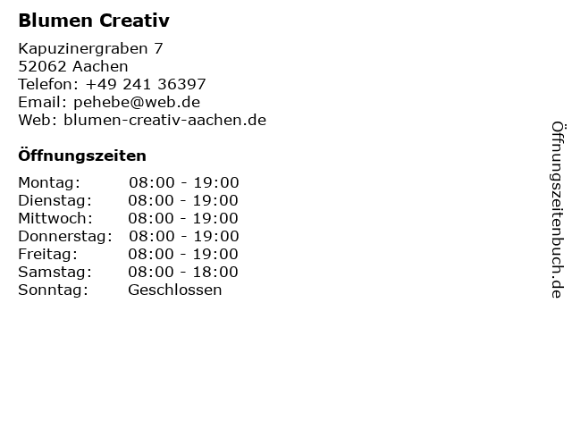 | Öffnungszeiten Blumen Creativ in Aachen anzeigen | |