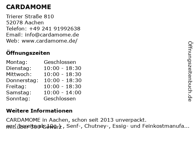 | Öffnungszeiten CARDAMOME in Aachen anzeigen | |