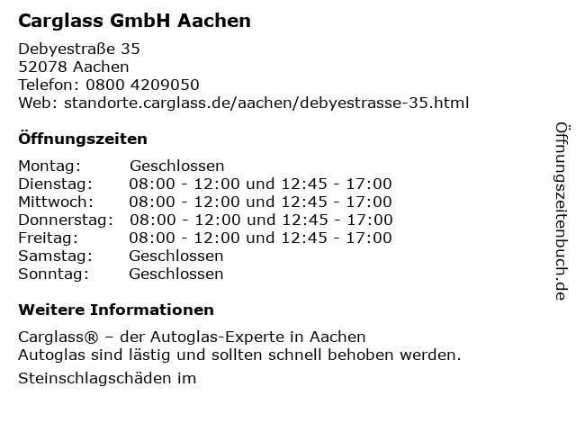 | Öffnungszeiten Carglass GmbH Aachen in Aachen anzeigen | |