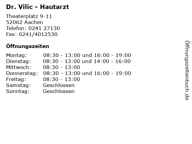 | Öffnungszeiten Dr. Vilic - Hautarzt in Aachen anzeigen | |