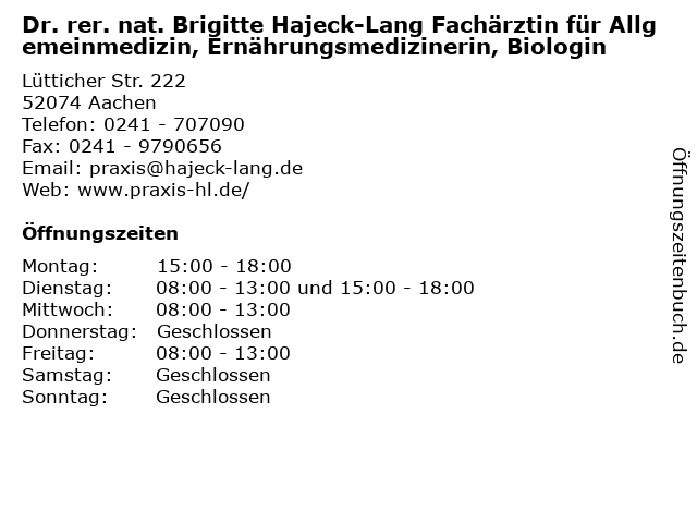 1 Praxis für Naturheilkunde Aixvitalis Brigitte Over (Entfernung: 0,59 km) Lütticher Str. 281 c, 52074 Aachen 2 Gabriele Krömann Fachärztin für Anästhesiologie (Entfernung: 0,83 km) Kaiser-Friedrich-Allee 15 -17, 52074 Aachen 3 Dr.med. Astrid Farber - Fachärztin für Psychotherapie (Entfernung: 1,06 km) Maria-Theresia-Allee 281, 52074 Aachen 5 Dr. Kerstin Büttner Fachärztin für Frauenheilkunde und Geburtshilfe, Zytologin (Entfernung: 1,41 km) Von-Brandis-Straße 2a, 52064 Aachen 6 |