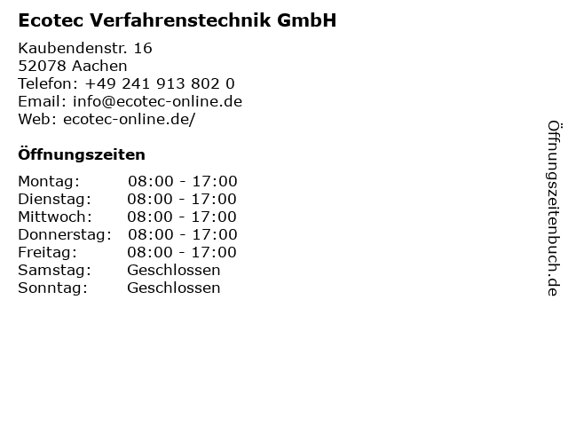 2 Lehrstuhl für Chemische Verfahrenstechnik und Institut für Verfahrenstechnik, Bibliothek (Entfernung: 5,86 km) Turmstr. 46, 52064 Aachen 3 FH & FH Project Engineering Verfahrenstechnik GmbH (Entfernung: 7,50 km) Wildbacher Mühle 61, 52074 Aachen 4 Derichs GmbH Verfahrenstechnik Anlagen- und Mühlenbau (Entfernung: 17,31 km) Daimlerstr. 25-29, 52531 Übach-Palenberg 5 Büro für Verfahrenstechnik u. Qualitätssicherung (Entfernung: 18,11 km) Goethestr. 84, 52499 Baesweiler 6 HD-Power Drucklufttechnik - Kompressoren- und Druckluftdienstleister (Bürozeiten) (Entfernung: 0,02 km) Kaubendenstraße 16, 52078 Aachen |