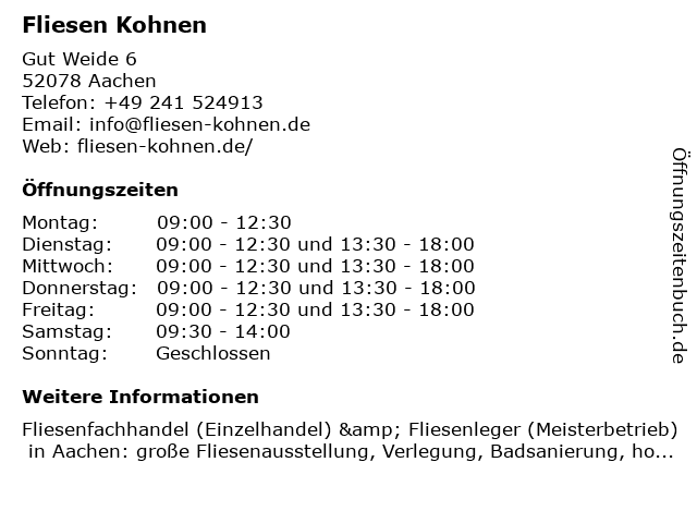 | Öffnungszeiten Fliesen Kohnen in Aachen anzeigen | |