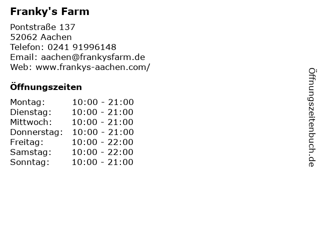 | Öffnungszeiten Franky's Farm in Aachen anzeigen | |