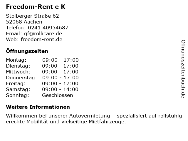 | Öffnungszeiten Freedom-Rent e K in Aachen anzeigen | |
