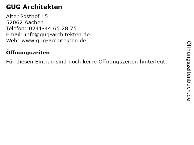 | Öffnungszeiten GUG Architekten in Aachen anzeigen | |