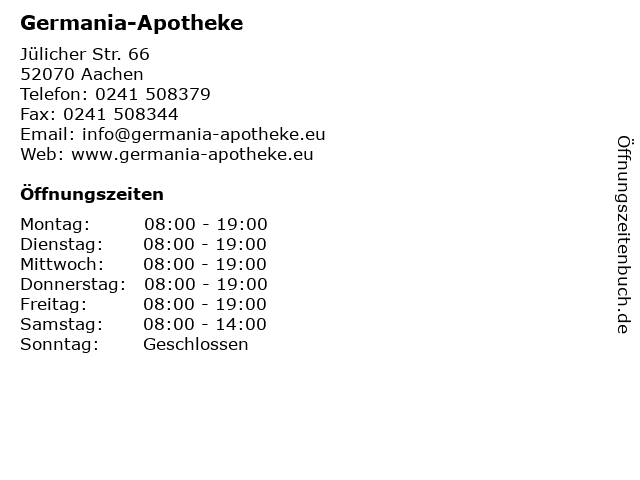 | Öffnungszeiten Germania-Apotheke in Aachen anzeigen | |