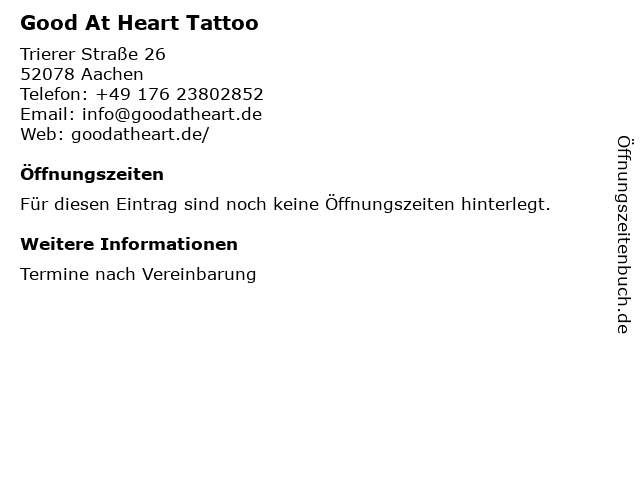 | Öffnungszeiten Good At Heart Tattoo in Aachen anzeigen | |
