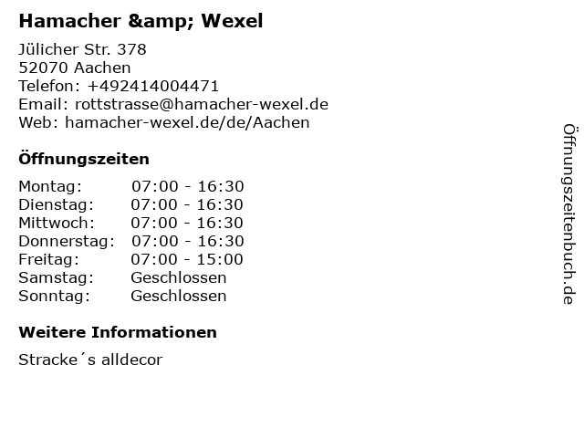 | Öffnungszeiten Hamacher & Wexel in Aachen anzeigen | |