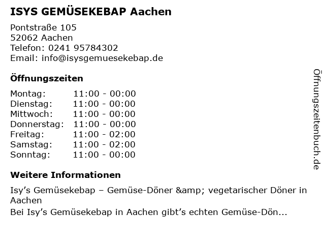 | Öffnungszeiten ISYS GEMÜSEKEBAP Aachen in Aachen anzeigen | |