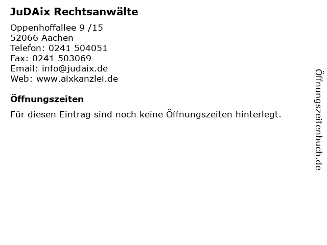 | Öffnungszeiten JuDAix Rechtsanwälte in Aachen anzeigen | |