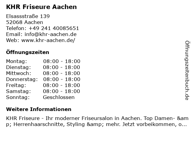 | Öffnungszeiten KHR Friseure Aachen in Aachen anzeigen | |