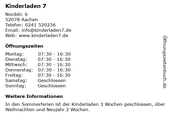 | Öffnungszeiten Kinderladen 7 in Aachen anzeigen | |