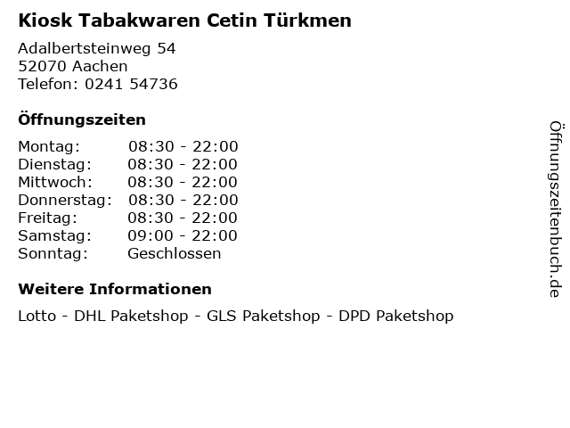 | Öffnungszeiten Kiosk Tabakwaren Cetin Türkmen in Aachen anzeigen | |