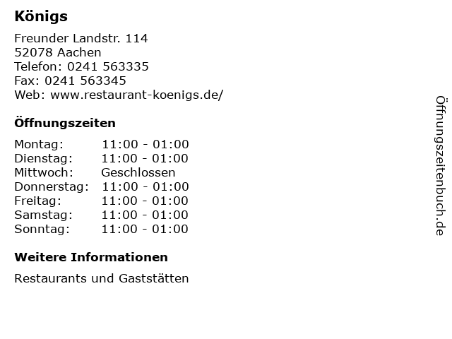 | Öffnungszeiten Königs in Aachen anzeigen | |