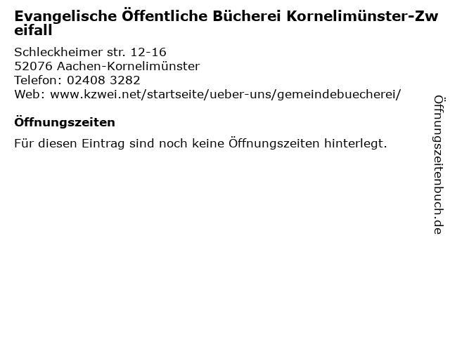 | Evangelische Öffentliche Bücherei Kornelimünster-Zweifall anrufen | |