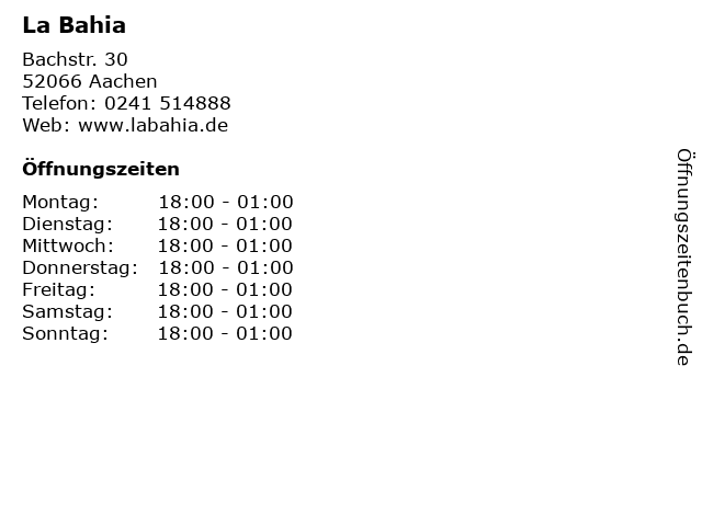 | Öffnungszeiten La Bahia in Aachen anzeigen | |