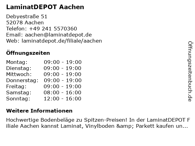 | Öffnungszeiten LaminatDEPOT Aachen in Aachen anzeigen | |
