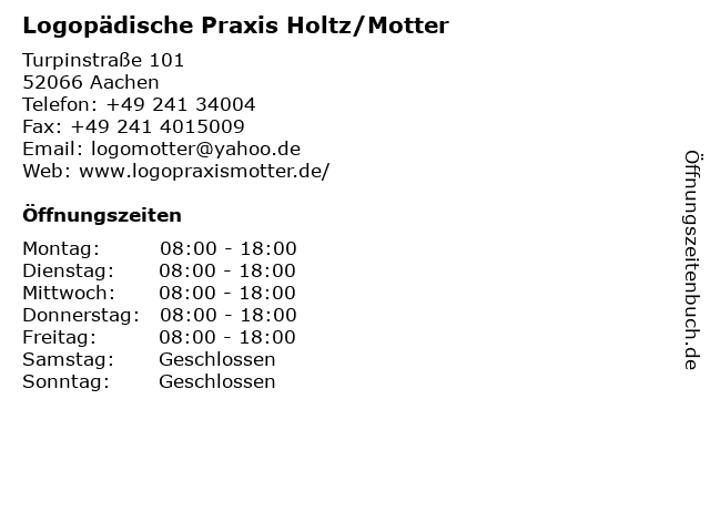 1 U. Stibany, Marianne Engelken, Angelika Fechtelpeter Logopädische Praxis (Entfernung: 1,64 km) Theaterplatz 13, 52062 Aachen 4 Autolackierung Weidenhaupt & Holtz (Entfernung: 6,90 km) Josef-Lambertz-Straße 28, 52134 Herzogenrath 5 Christiane Dickmann, Birgit Burzey Logopädische Praxis (Entfernung: 8,21 km) Birkengangstr. 5, 52222 Stolberg 6 |