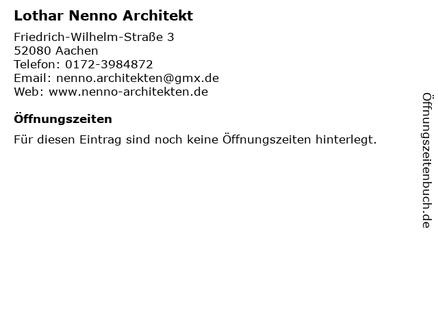 | Öffnungszeiten Lothar Nenno Architekt in Aachen anzeigen | |