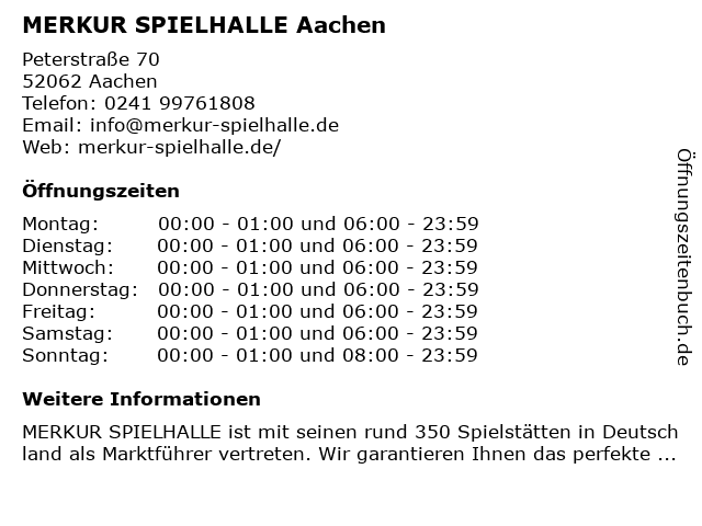 | Öffnungszeiten MERKUR SPIELHALLE Aachen in Aachen anzeigen | |