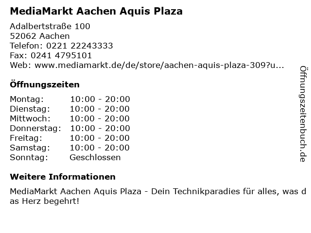 | Öffnungszeiten MediaMarkt Aachen Aquis Plaza in Aachen anzeigen | |