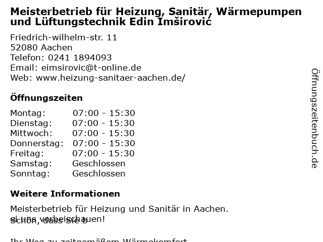 1 Edin Imsirovic Installateur- und Heizungsbauermeister (Entfernung: 0,00 km) Friedrich-Wilhelm-Str. 11, 52080 Aachen 2 Ralf Baumann, - Meisterbetrieb für Sanitär- und Heizungstechnik (Entfernung: 2,76 km) Weiern 71, 52078 Aachen 6 |