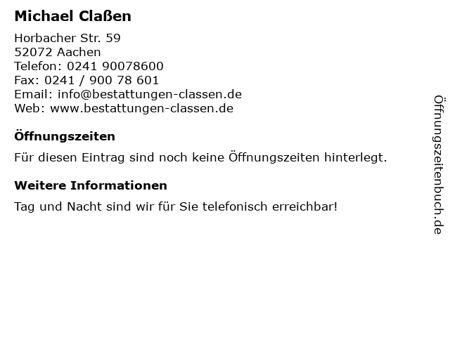 | Öffnungszeiten Michael Claßen in Aachen anzeigen | |