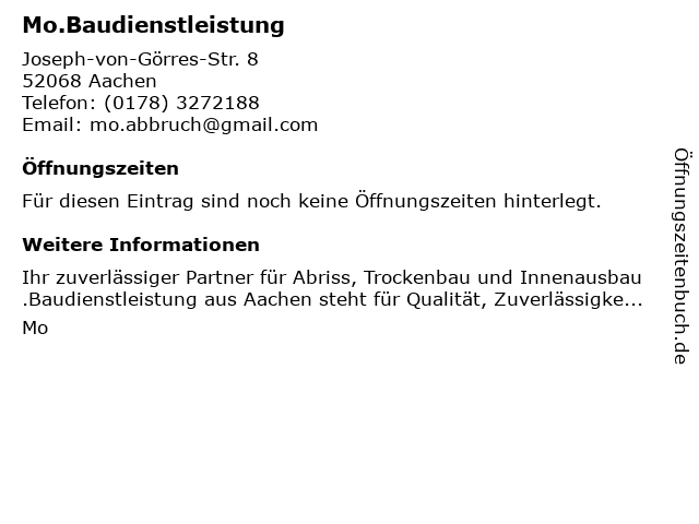 | Öffnungszeiten Mo.Baudienstleistung in Aachen anzeigen | |
