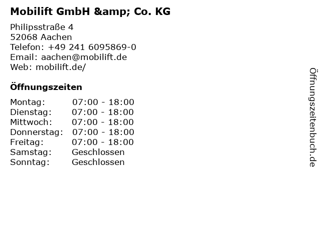 | Öffnungszeiten Mobilift GmbH & Co. KG in Aachen anzeigen | |