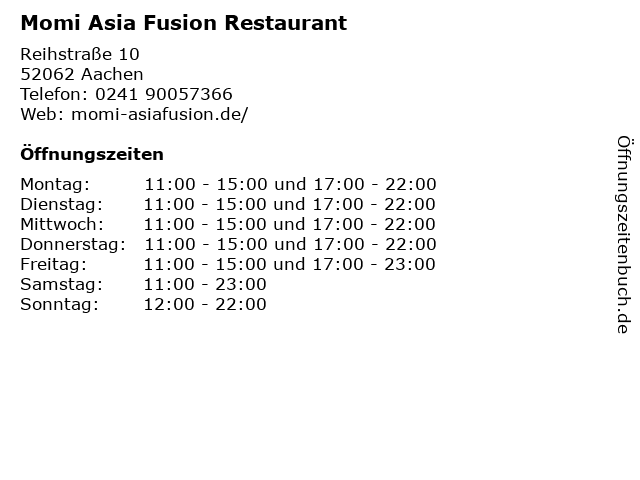 | Öffnungszeiten Momi Asia Fusion Restaurant in Aachen anzeigen | |