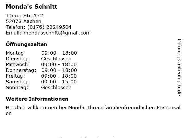 | Öffnungszeiten Monda's Schnitt in Aachen anzeigen | |