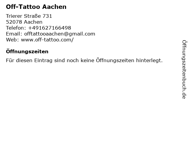 | Öffnungszeiten Off-Tattoo Aachen in Aachen anzeigen | |
