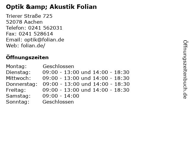 | Öffnungszeiten Optik & Akustik Folian in Aachen anzeigen | |