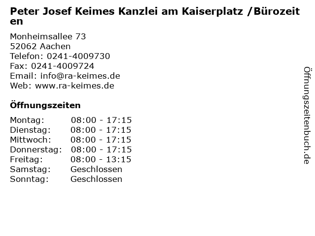 Branchen & Suchbegriffe zu Peter Josef Keimes Kanzlei am Kaiserplatz /Bürozeiten:/bürozeiten, anwalt, anwaltskanzlei, josef, kaiserplatz, kanzlei, keimes, notar, peter, rechtsanwalt |