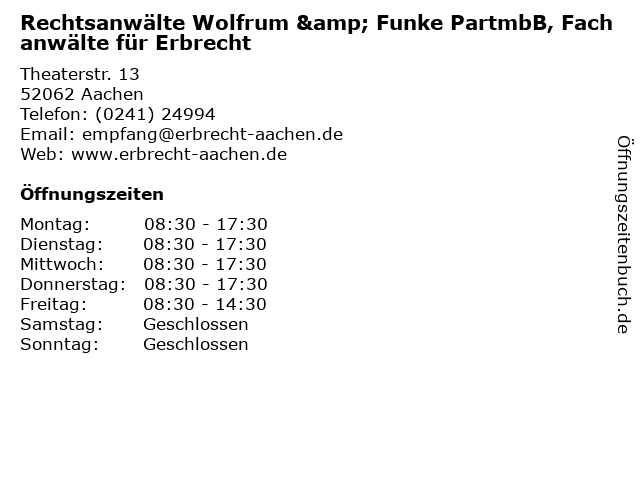 1 Rechtsanwaltskanzlei Sebastian Wolfrum Fachanwalt für Erbrecht (Entfernung: 0,01 km) Theaterstraße 13, 52062 Aachen 3 Momm und Huppertz Rechtsanwälte & Fachanwälte für Strafrecht (Entfernung: 0,54 km) Wilhelmstraße 9, 52070 Aachen 4 Dr. Lindemann Dr. Müller Rechtsanwälte & Fachanwälte (Entfernung: 1,10 km) Oppenhoffallee 46, 52066 Aachen 6 |