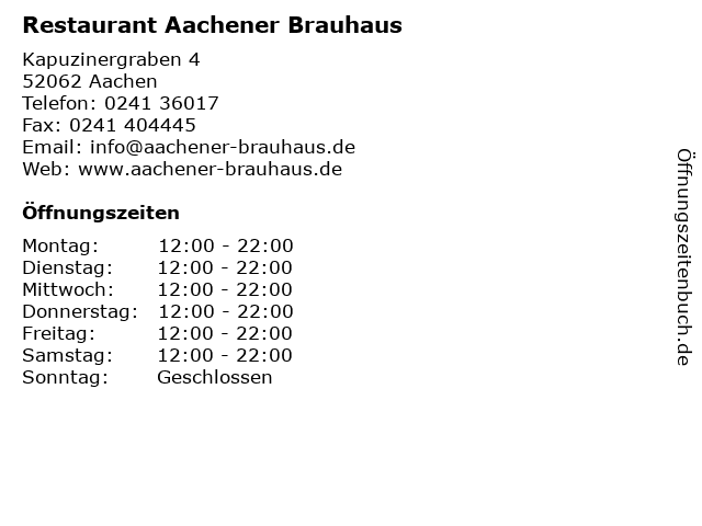 | Öffnungszeiten Restaurant Aachener Brauhaus in Aachen anzeigen | |