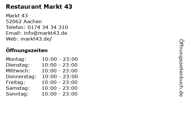 | Öffnungszeiten Restaurant Markt 43 in Aachen anzeigen | |