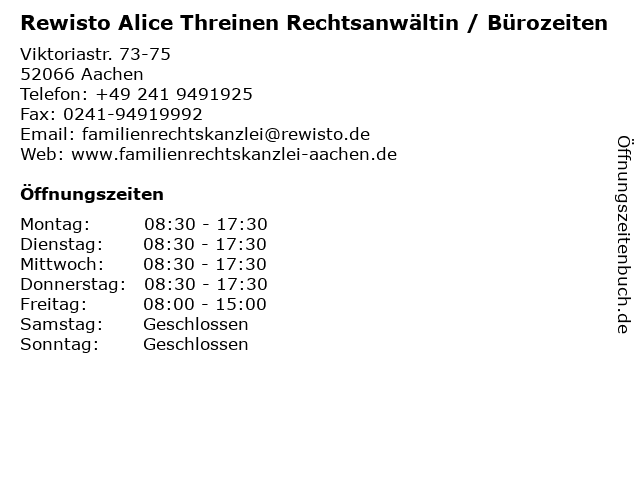 Branchen & Suchbegriffe zu Rewisto Alice Threinen Rechtsanwältin / Bürozeiten:alice, bürozeiten, fachanwältin, familienrecht, rechtsanwältin, rewisto, threinen |
