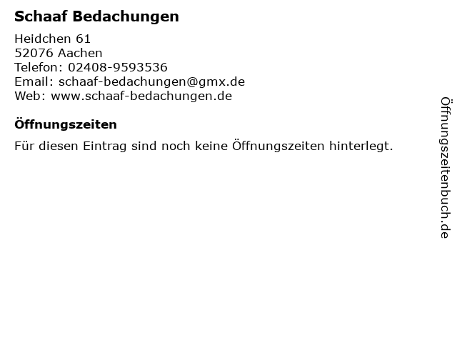 | Öffnungszeiten Schaaf Bedachungen in Aachen anzeigen | |